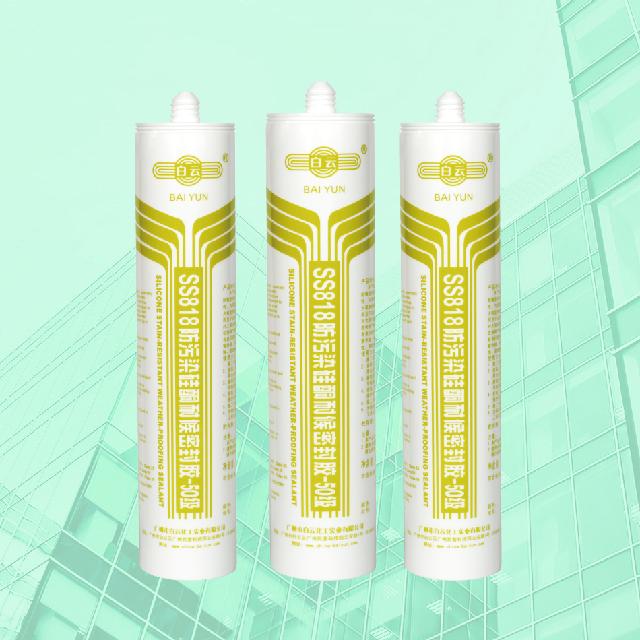 SS818是单组分,中性固化,专为各种幕墙(玻璃幕墙、铝板幕墙、石材幕墙等)的防污染耐候密封而设计的硅酮密封胶。与常规硅酮耐候密封胶相比,不仅具有优异的耐候性能,而且具有优异的防污染性能。通过产品的特殊配方设计,密封胶可以最大程度的减少玻璃、金属及石材幕墙水平接缝附近的垂流污染现象,而且密封胶不会对石材等多孔性材料产生污染,对各类大理石、花岗石等材质具有良好的粘结效果。经过人工加速气候老化测试,密封胶的各项理化性能无明显变化。使用时用挤胶枪将胶从密封胶筒中挤到需要密封的接缝中,密封胶在室温下吸收空气中的水分,固化成弹性体,形成有效密封。
