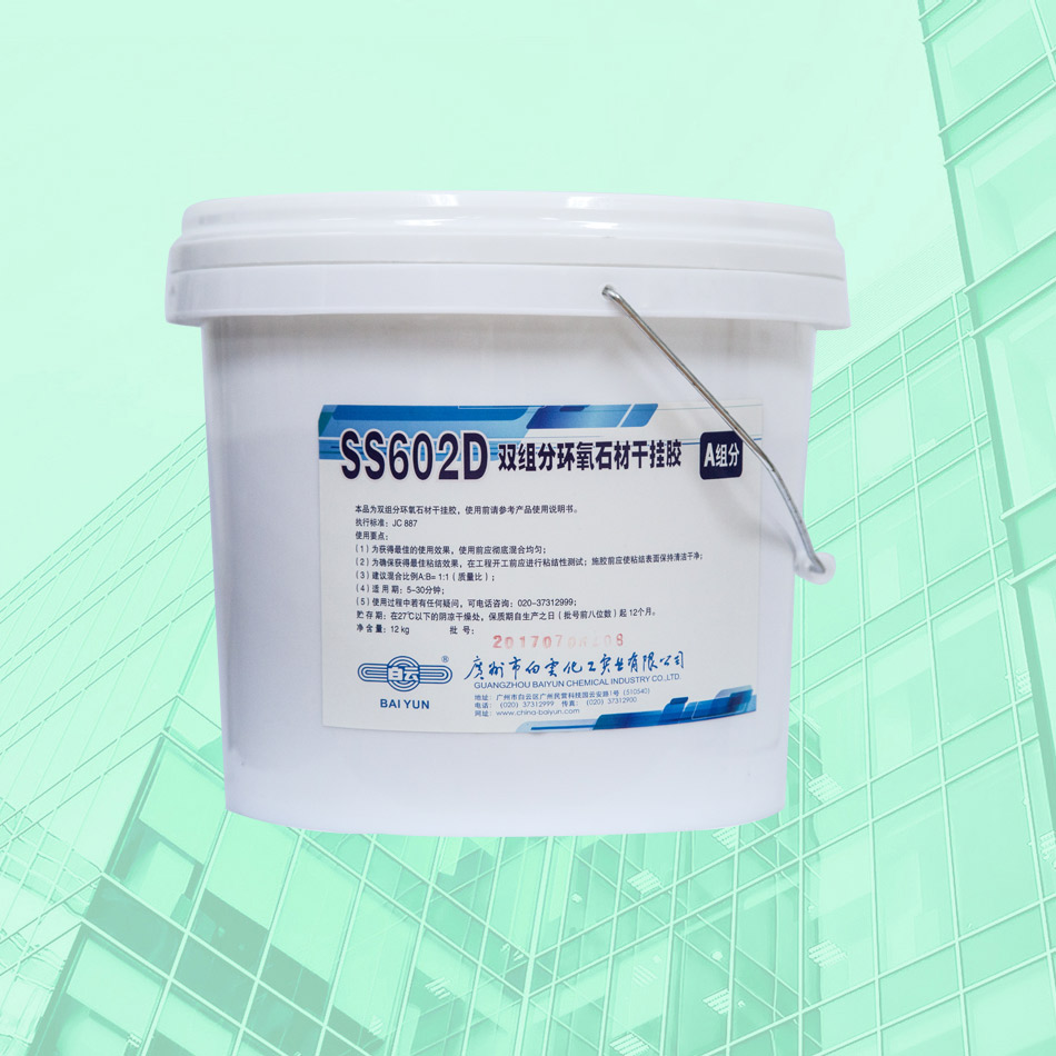 SS602D环氧石材干挂胶属于改性环氧树脂聚合物,是一种快速固化的双组分、高模量、高强度的胶粘剂,可广泛应用于各种石材、金属、玻璃、混凝土建筑构件、木材等材料的粘结;干挂法安装石材幕墙、金属件的粘结;地板砖、瓷砖的粘贴;工程植筋、结构补强、粘接加固等。SS602D分A、B两个组分,A组分为白色,B组分为黄色,混合后为浅黄色。